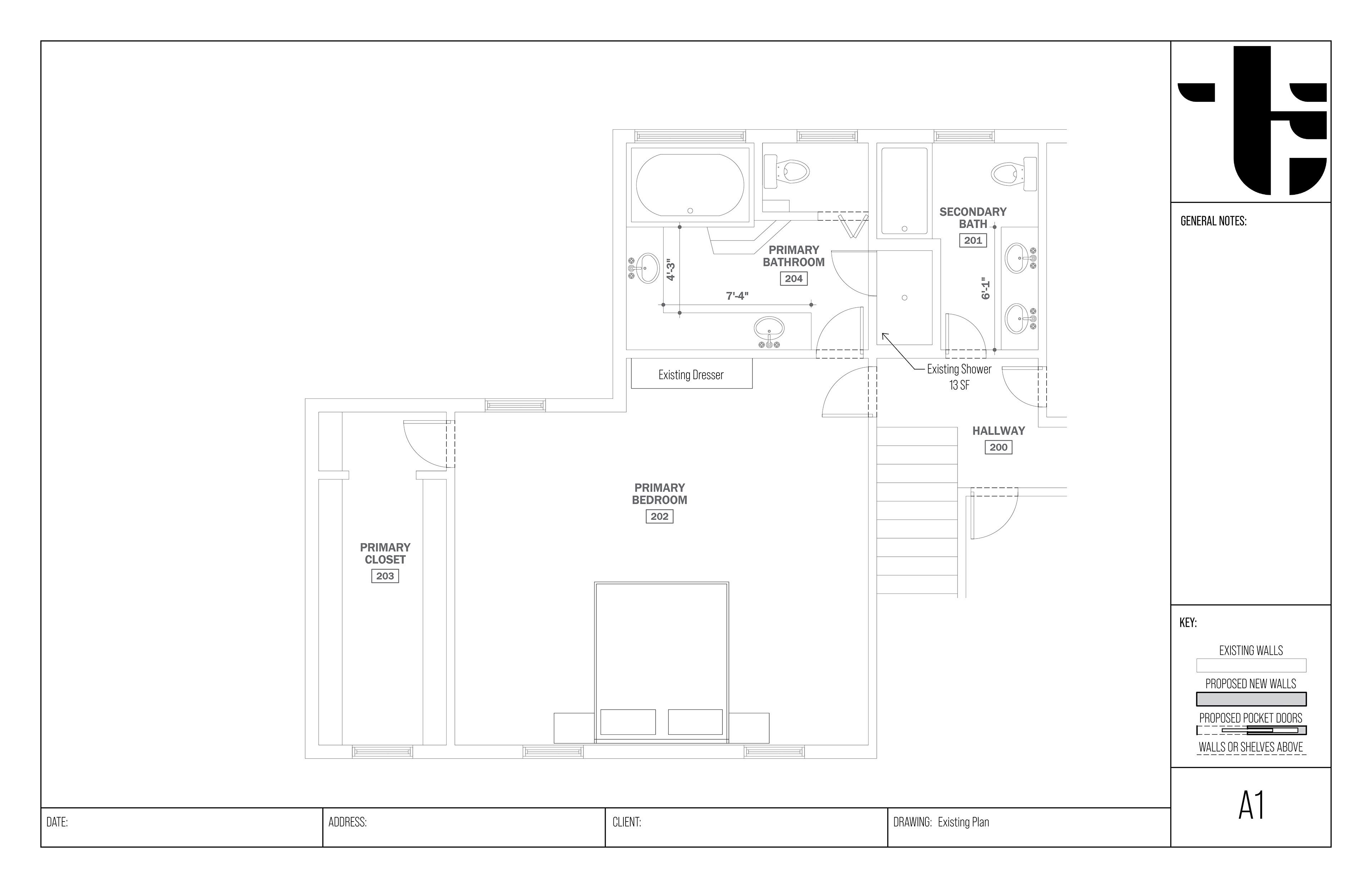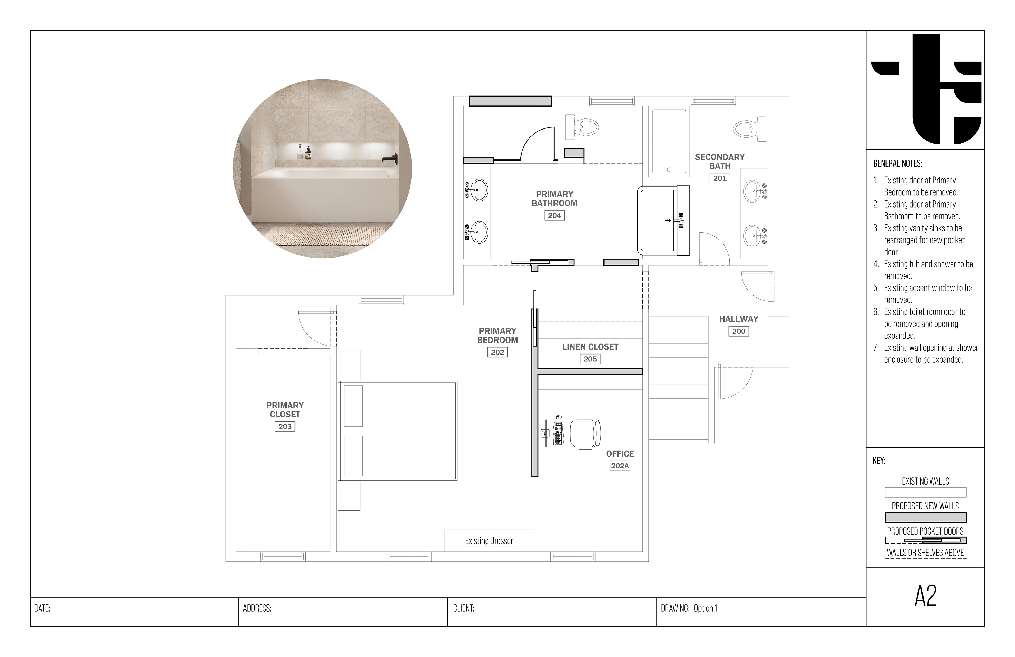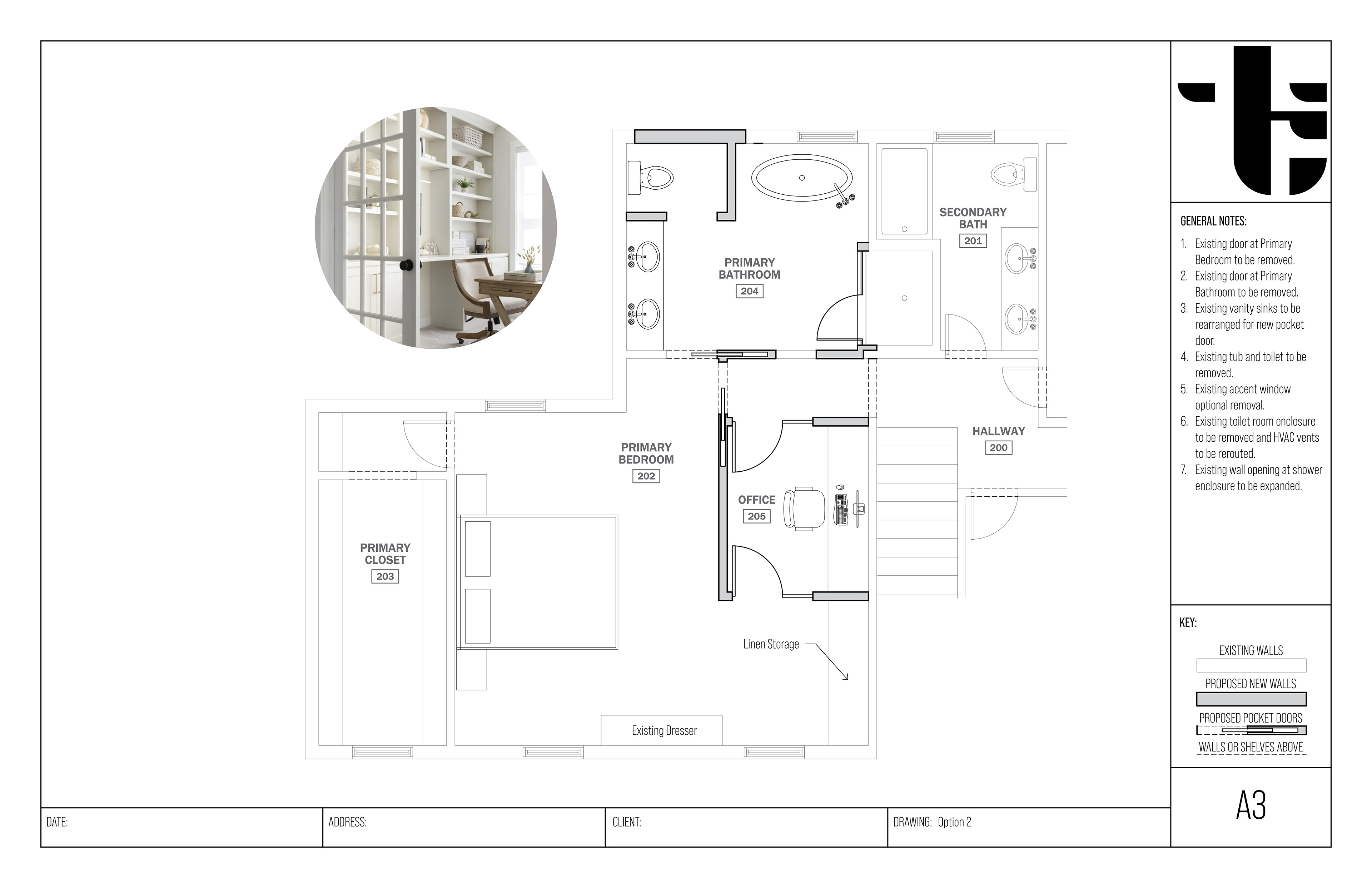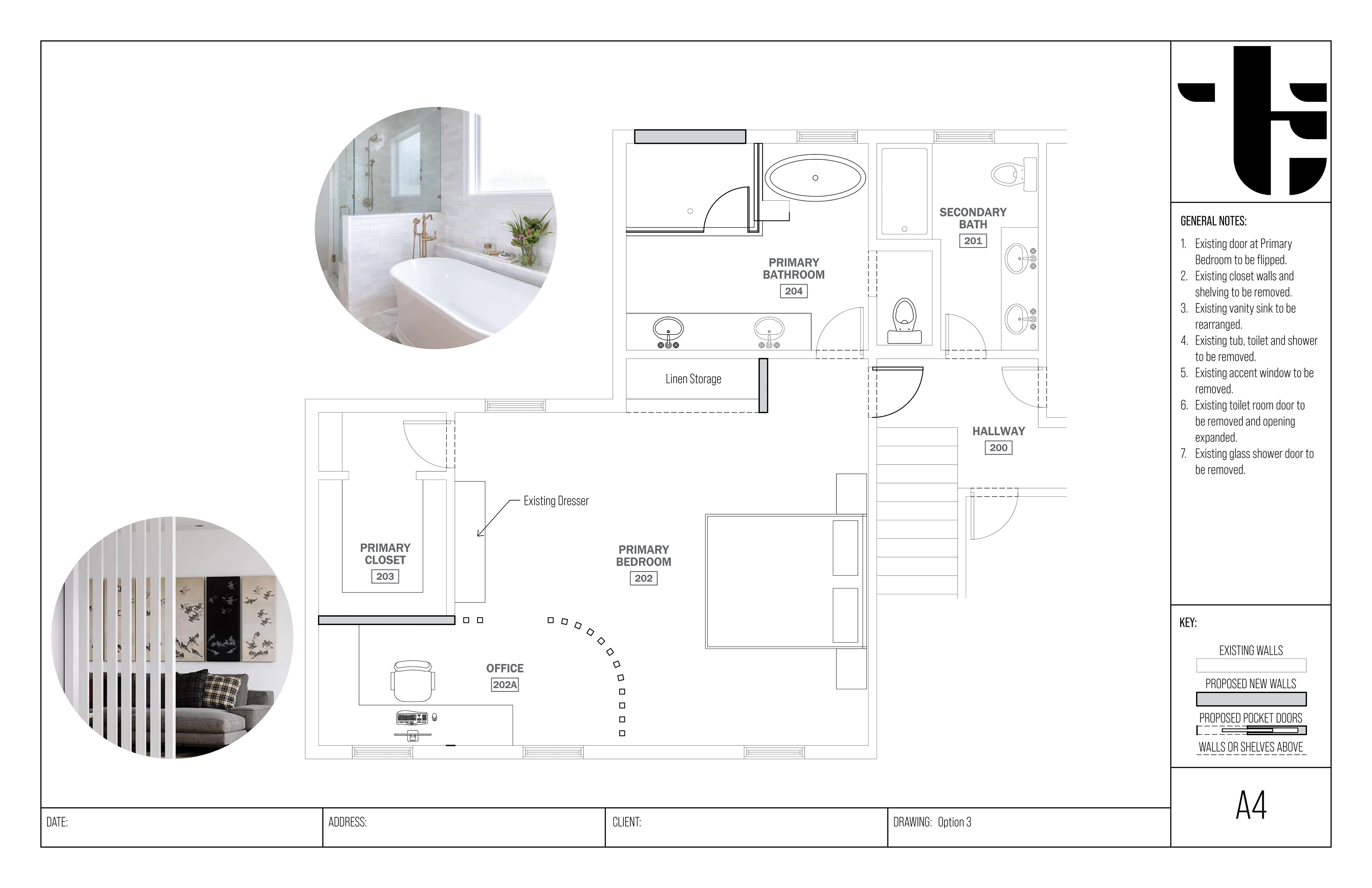 Iteration with our clients is an integral component to any successful design. On this project, we worked collaboratively through different creative solutions for the floor plan to achieve the client's vision. We were able to study the existing primary bed and bath suite conditions to incorporate a potential at home office and a more efficient layout.